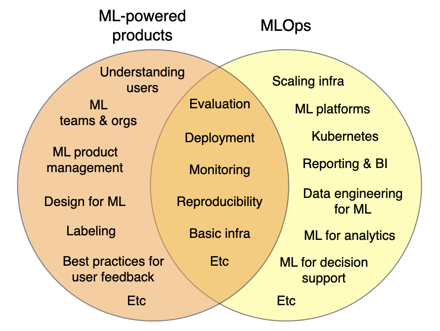 ML-powered product building is a distinct but overlapping discipline. A lot of what it takes to build a great ML-powered product goes beyond the infrastructure side of ML systems. It focuses on how to fit ML into the context of the product or the application that you're building.