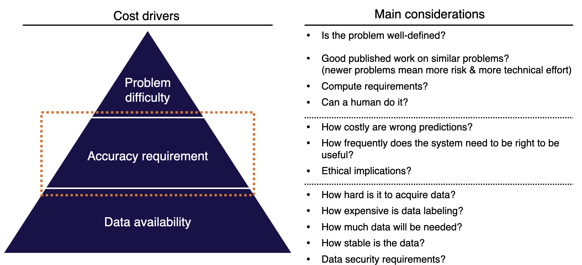 Accuracy requirement: How costly are wrong predictions? How frequently does the system need to be right to be useful? What are the ethical implications of your model making wrong predictions? It is noteworthy that ML project costs tend to scale super-linearly in the accuracy requirement.