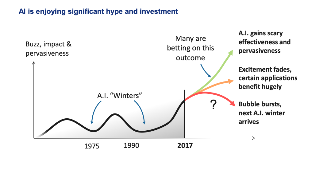 A true AI winter, where people become skeptical about AI as a technology. We think this is less likely.