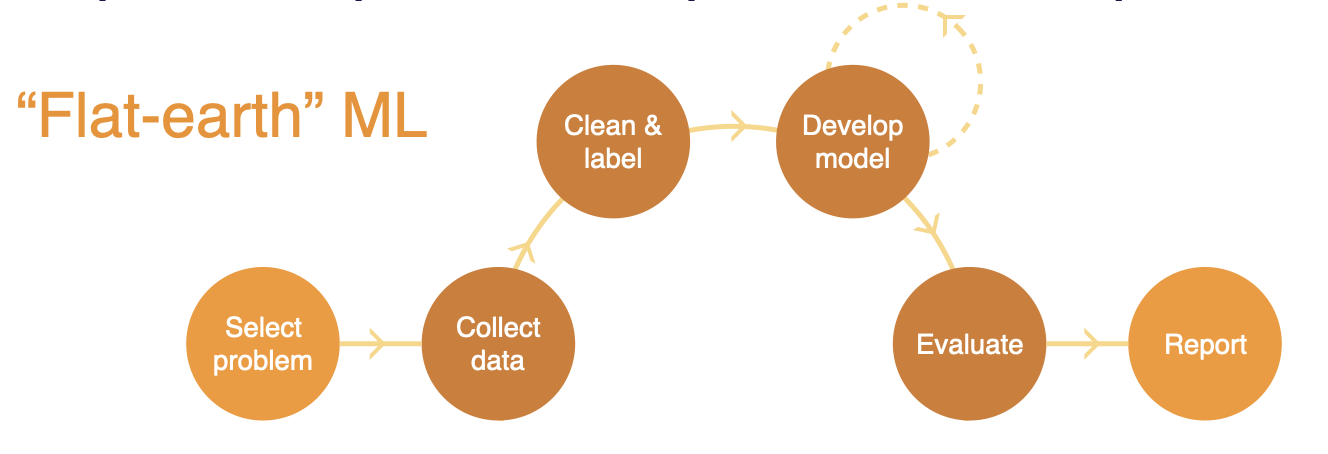In academia, you build "flat-earth" ML - selecting a problem, collecting data, cleaning and labeling the data, iterating on model development until you have a model that performs well on the dataset collected, evaluating that model, and writing a report at the end.