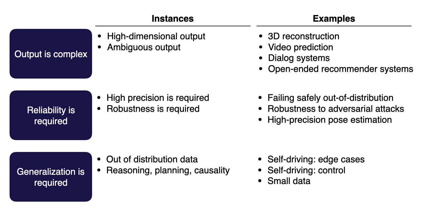 Generalization is required: These problems tend to be more in the research domain. They can deal with out-of-distribution data or do tasks such as reasoning, planning, or understanding causality.