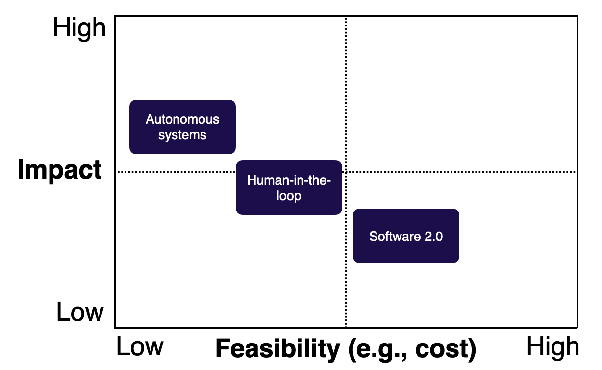 This is a pretty intuitive evaluation you can apply to all your ML projects: If it's harder to build (like autonomous systems), it's likely to have a greater impact! There are ways, however, to change this matrix in the context of specific projects.
