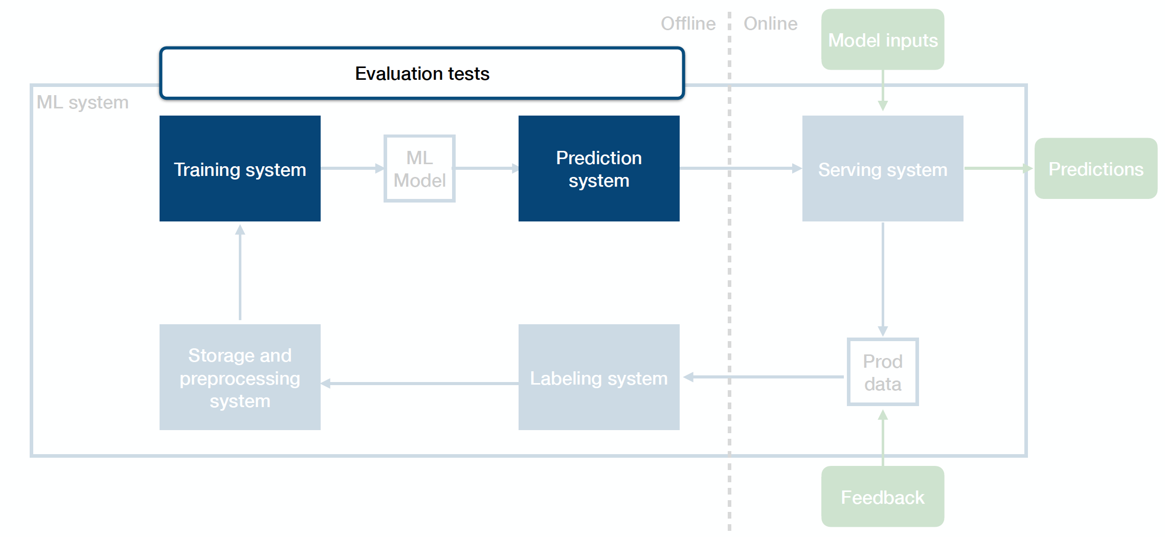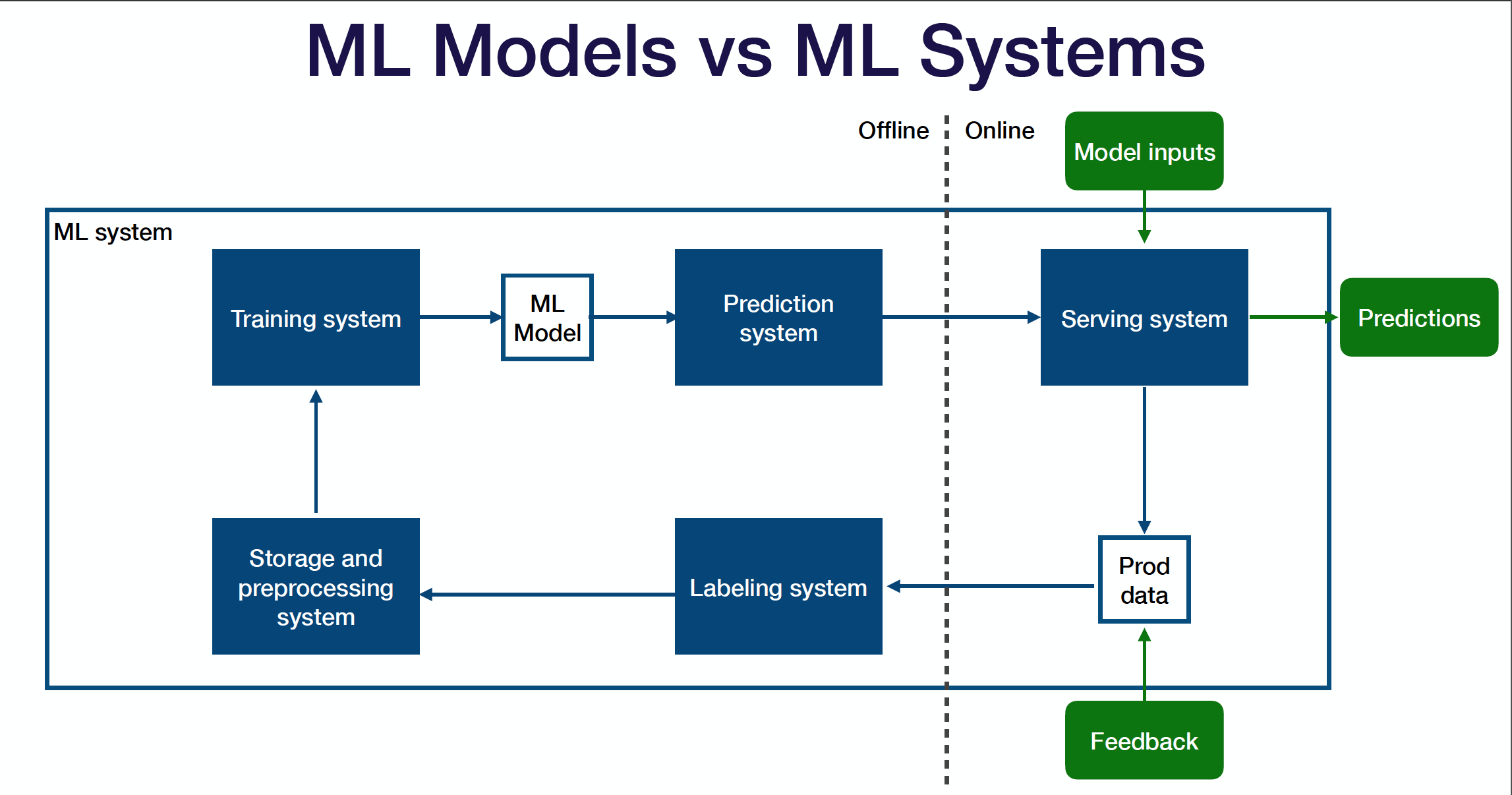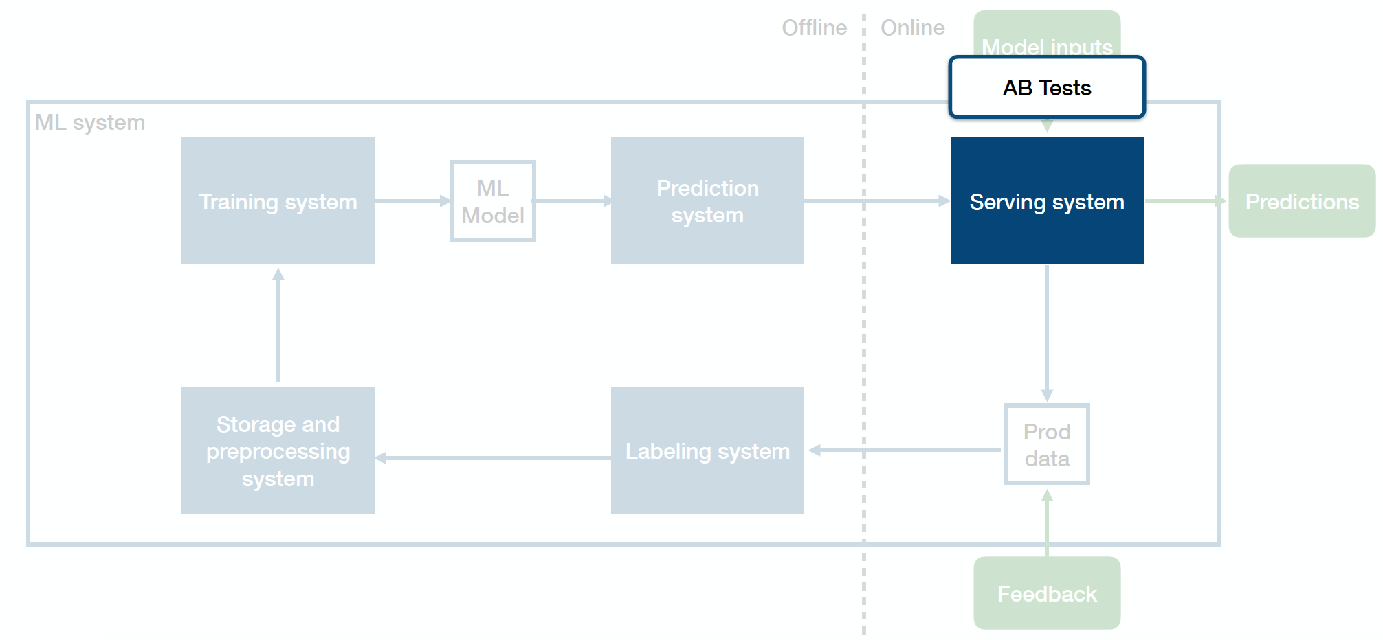 Above is the diagram of how you can think of your entire production ML system that straddles across the offline and online environments: