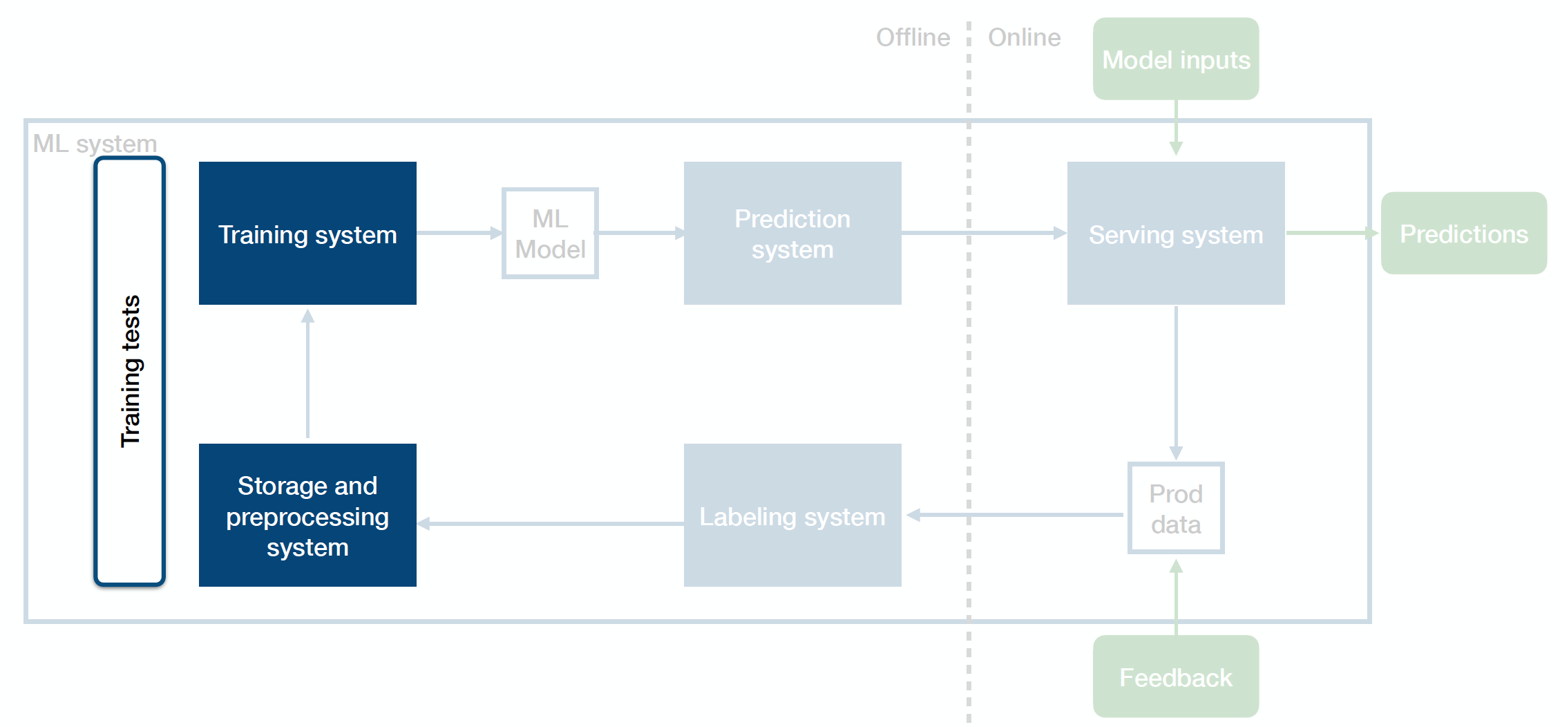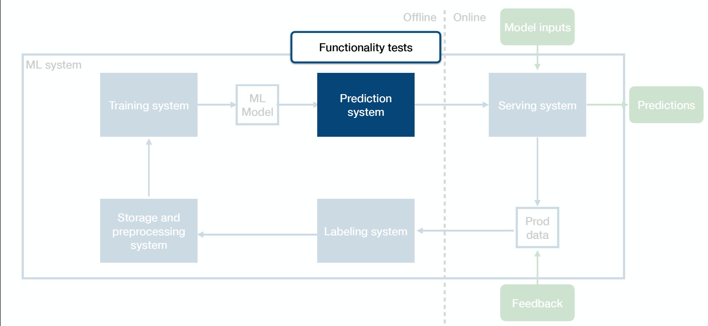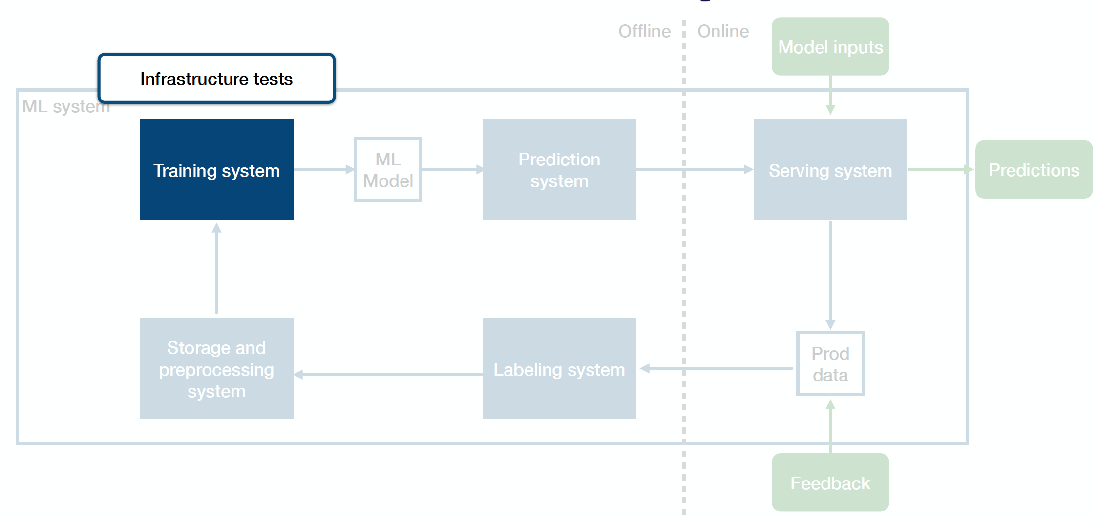 One way to think about how to test ML systems the right way is to think about the tests that you can run for each system component and across the border of these components.