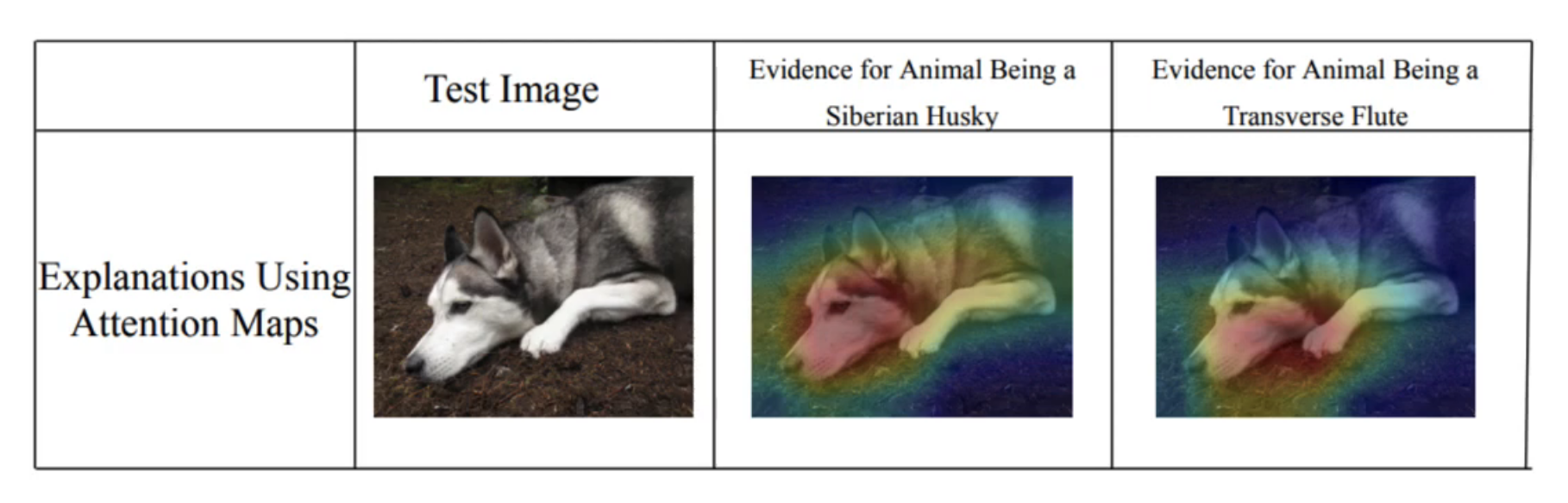 Another class of models that are interpretable is attention models. Examining where a model is “looking” helps us anticipate a model’s prediction, thus making them interpretable. However, attention maps are not particularly explainable. They do not produce complete explanations for a model’s output, just a directional explanation. Furthermore, attention maps are not reliable explanations. Attention maps tell us only where a model is looking, not why it is looking there. Frequently, models focus exclusively on an image’s salient region without an underlying reasoning that relates to the task at hand. In the sample below, the attention model is “looking” at the salient region for classification, which has a very different meaning in each context.