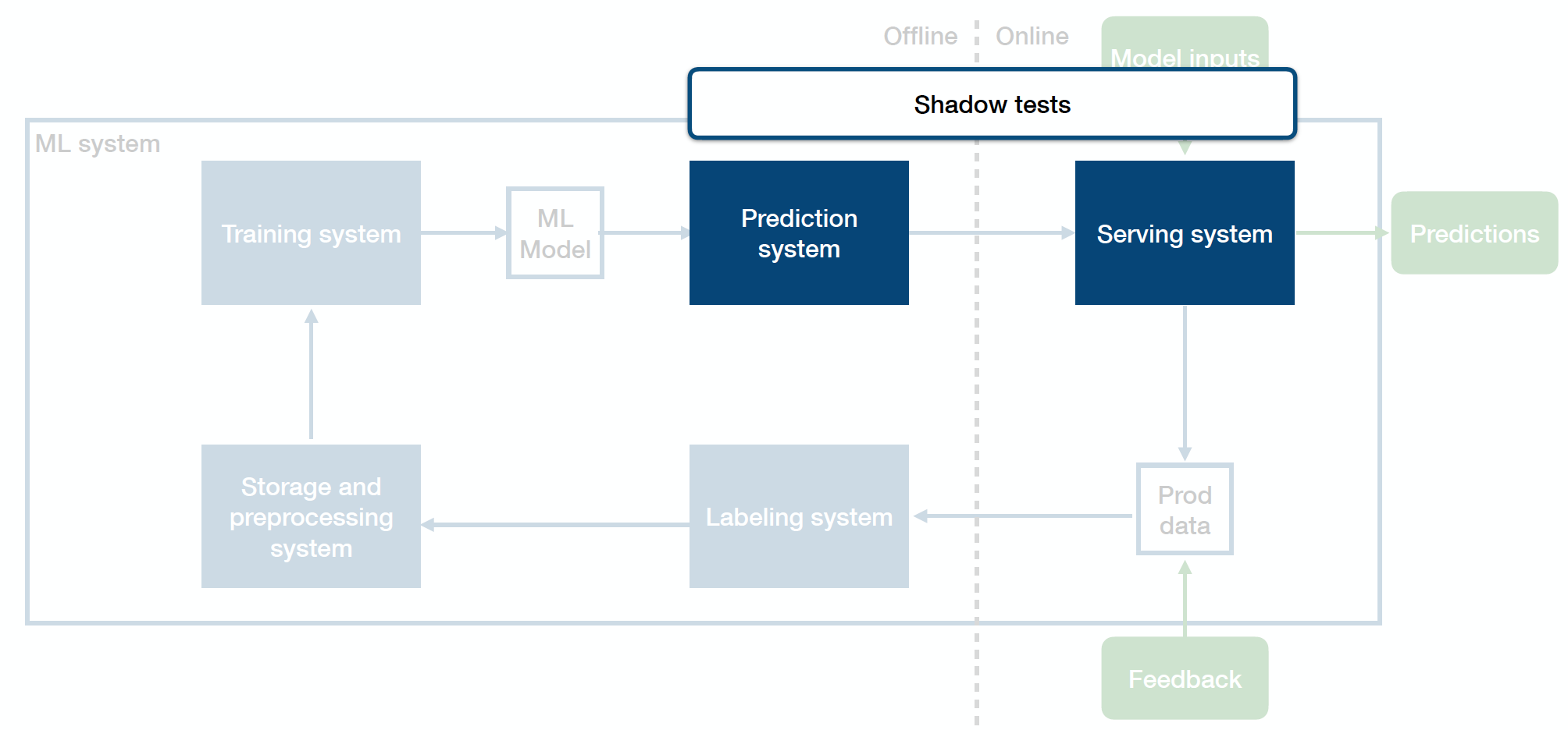 Secondly, shadow tests also help you detect inconsistencies between the offline model and the online model. There’s a translation step in the training pipeline in many companies - going from the offline trained model to the online production model (the model itself, the preprocessing pipeline, etc.). A common bug source in production ML systems happens because of the inconsistencies cropping up in that translation step. A good health check ensures that your actual production model is producing the exact predictions on a fixed set of data as the model you have running on your laptop.