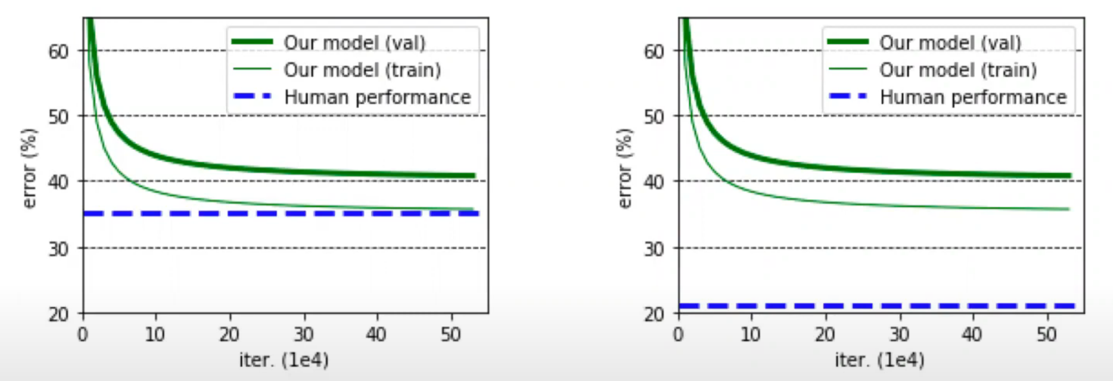 Baselines are especially important for helping decide the next steps. Consider the example below of two models with the same loss curve but differing performance with respect to the baseline. Clearly, they require different action items! As seen below, on the left, where we are starting to approach or exceed the baseline, we need to be mindful of overfitting and perhaps incorporate regularization of some sort. On the right, where the baseline hugely exceeds our model’s performance, we clearly have a lot of work to do to improve the model and address its underfitting.