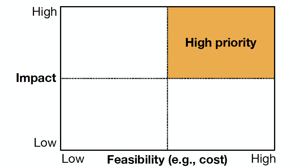 To prioritize projects to work on, you want to find high-impact problems and assess the potential costs associated with them. The picture below shows a general framework that encourages us to target projects with high impact and high feasibility.
