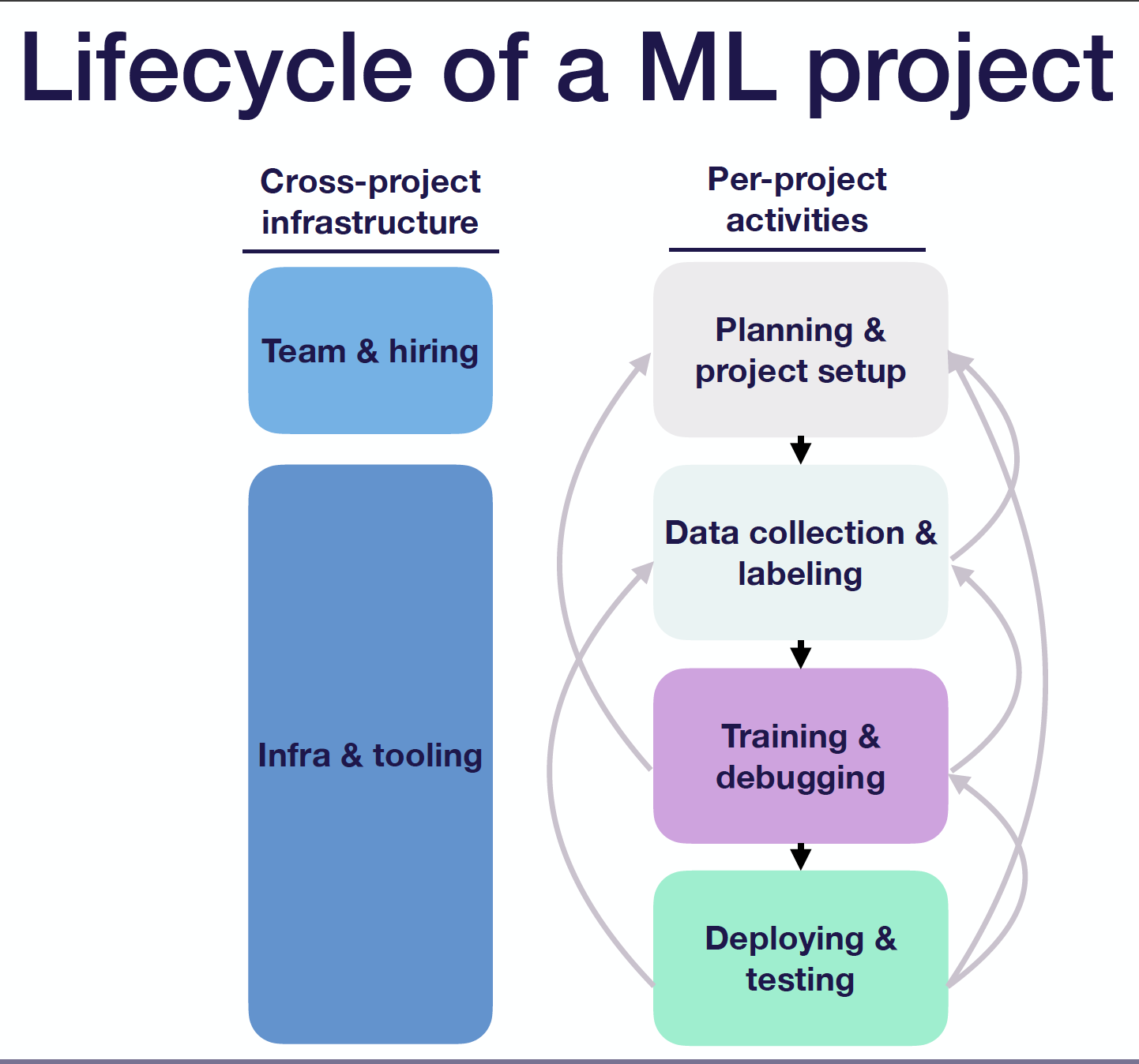 Model Training and Model Debugging: At this phase, we want to implement baseline models quickly, find and reproduce state-of-the-art methods for the problem domain, debug our implementation, and improve the model performance for specific tasks. We may realize that we need to collect more data or that labeling is unreliable (thus, go back to phase 2). Or we may recognize that the task is too challenging and there is a tradeoff between project requirements (thus, go back to phase 1).