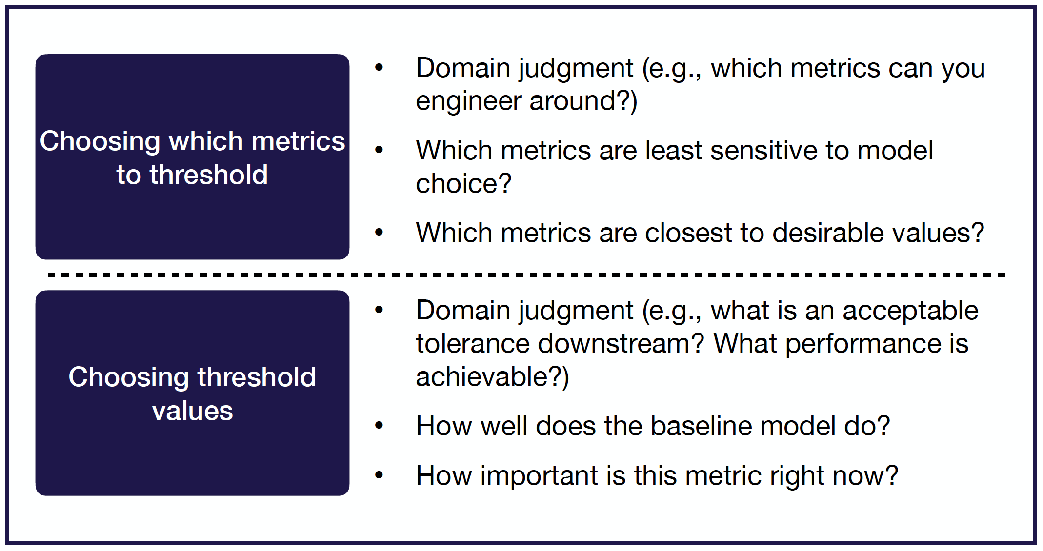 More practically, you can apply a threshold evaluation to the model’s metrics. In this method, out of n evaluation metrics, you threshold n-1 and optimize the nth metric. For example, if we look at a model’s precision, memory requirement, and cost to train, we might threshold the memory requirement (no more than X MB) and the cost (no more than $X) and optimize precision (as high as possible). As you choose which metrics to threshold and what to set their threshold values to, make sure to consider domain-specific needs and the actual values of the metrics (how good/bad they might be).