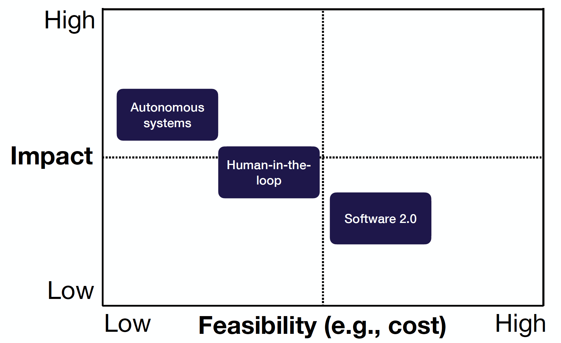 In the case of human-in-the-loop systems, their feasibility and impact sit squarely in between autonomous systems and software 2.0. HIL systems, in particular, can benefit disproportionately in their feasibility and impact from effective product design, which naturally takes into account how humans interact with technology and can mitigate risks for machine learning model behavior. Consider how the Facebook photo tagging algorithm is implemented. Rather than tagging the user itself, the algorithm frequently asks the user to tag themselves. This effective product design allows the model to perform more effectively in the user’s eye and reduces the impact of false classifications. Grammarly similarly solicits user input as part of its product design through offering explanations. Finally, recommender systems also implement this idea. In general, good product design can smooth the rough edges of ML (check out the concept of designing collaborative AI).