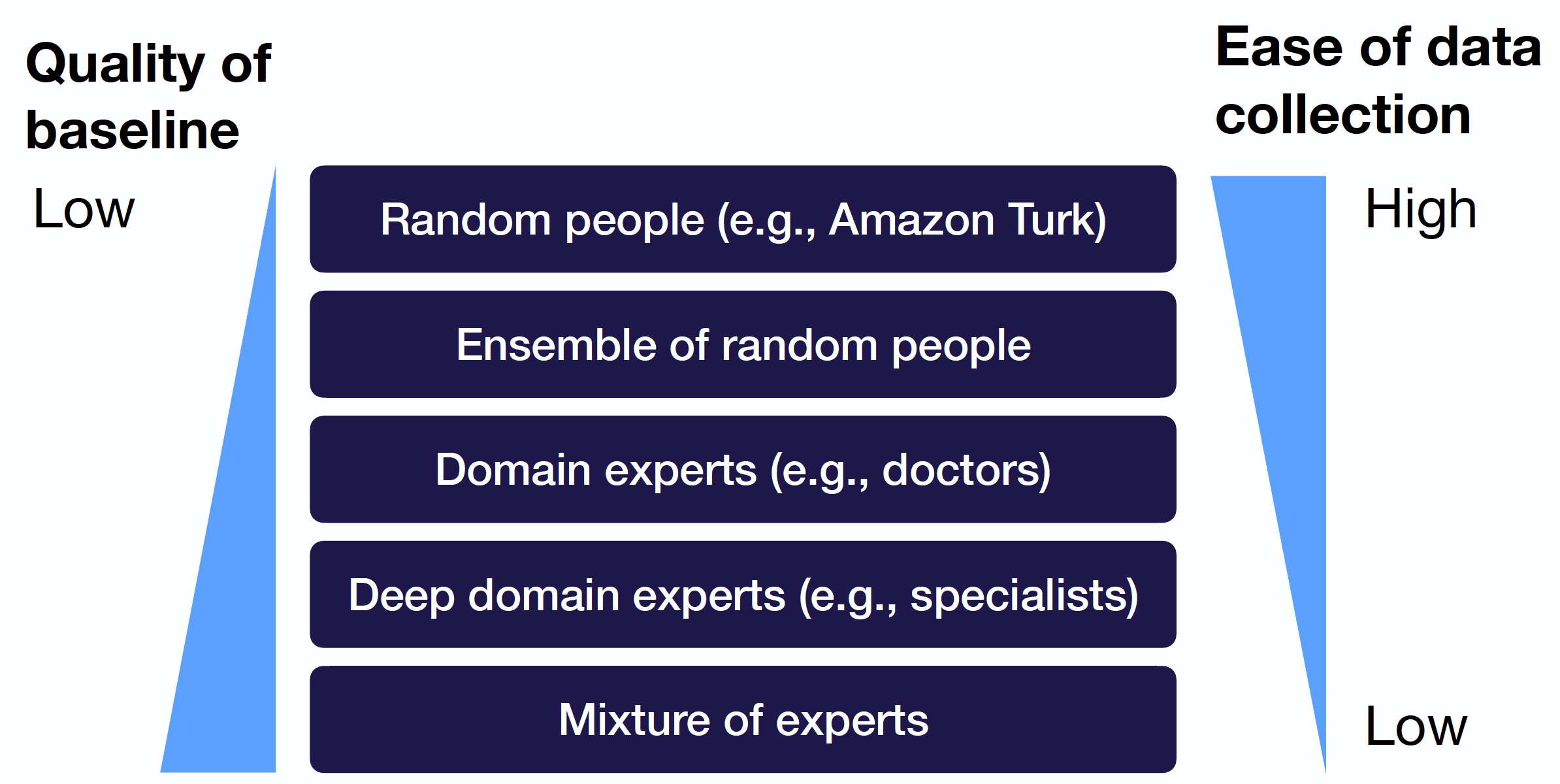 Human baselines are a particularly powerful form of baseline since we often seek to replace or augment human actions. In creating these baselines, note that there’s usually an inverse relationship between the quality of the baseline and the ease of data collection. In a nutshell, the harder it is to get a human baseline, the better and more useful it probably is.